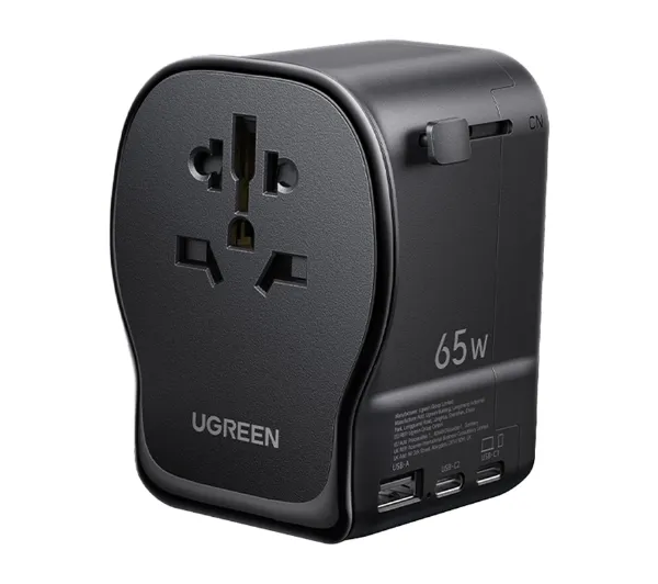 <h2>Adapter podróżny UGREEN S550 65W</h2><p>Ugreen S550 to kompaktowy, a jednocześnie bardzo wydajny adapter podróżny z funkcją ładowarki sieciowej, który został zaprojektowany z myślą o osobach często przemieszczających się między krajami. Obsługuje wtyczki w standardzie USA, Wielkiej Brytanii, Niemiec oraz Chin, dzięki czemu jest kompatybilny z większością gniazdek stosowanych na świecie. Oferuje moc do 65W oraz możliwość jednoczesnego ładowania trzech urządzeń, zapewniając stabilną i bezpieczną pracę dzięki nowoczesnej technologii GaN (azotek galu, materiał półprzewodnikowy zwiększający wydajność i zmniejszający straty energii).</p><h2>Jedno urządzenie – wiele krajów</h2><p>Model S550 eliminuje konieczność zabierania kilku oddzielnych przejściówek. Wbudowane, wysuwane wtyczki w standardach US, UK, DE oraz CN pozwalają bez problemu podłączyć adapter do gniazdek używanych w ponad 90% krajów. To praktyczne rozwiązanie znacząco ogranicza ilość akcesoriów w bagażu i upraszcza organizację podczas podróży służbowych oraz wakacyjnych wyjazdów. Jeden adapter wystarcza, aby bezpiecznie zasilić urządzenia niemal w każdym miejscu.</p><h2>Technologia GaN – większa wydajność i mniejsze nagrzewanie</h2><p>Zastosowanie półprzewodników GaN pozwoliło zwiększyć efektywność pracy ładowarki przy jednoczesnym ograniczeniu jej rozmiaru i poziomu nagrzewania. Dzięki temu urządzenie działa stabilnie nawet podczas długotrwałego ładowania kilku sprzętów jednocześnie. Wbudowany system kontroli temperatury na bieżąco monitoruje parametry pracy i automatycznie dostosowuje moc, chroniąc adapter oraz podłączone urządzenia przed przegrzaniem. Przekłada się to na większą trwałość sprzętu i bezpieczeństwo codziennego użytkowania.</p><h2>Jednoczesne ładowanie trzech urządzeń</h2><p>Ugreen S550 został wyposażony w dwa porty USB-C (Universal Serial Bus Type-C, uniwersalne złącze do przesyłania danych i zasilania) oraz jeden port USB-A (Universal Serial Bus Type-A, standardowe złącze do przesyłania danych i zasilania), co umożliwia ładowanie trzech urządzeń w tym samym czasie. Inteligentny system rozdzielania mocy dopasowuje parametry do potrzeb każdego podłączonego sprzętu, oferując konfigurację 7,5W + 7,5W + 45W przy pracy wieloportowej. Port USB-C obsługuje szybkie ładowanie w standardzie Power Delivery (standard szybkiego ładowania opracowany dla złączy USB-C) o mocy do 65W, co pozwala na bardzo sprawne uzupełnianie energii w laptopach, tabletach czy smartfonach. Przykładowo, MacBook Pro może odzyskać około 51% baterii w zaledwie 30 minut. Odpowiednie zarządzanie energią wspiera kondycję akumulatorów i minimalizuje ryzyko przeładowania.</p><h2>Funkcja 2w1 – adapter i ładowarka w jednym</h2><p>S550 łączy w sobie rolę klasycznego adaptera podróżnego oraz pełnowartościowej ładowarki sieciowej. Dzięki temu nie ma potrzeby pakowania oddzielnych urządzeń do konwersji wtyczki i ładowania elektroniki. Intuicyjna konstrukcja sprawia, że korzystanie z niego jest szybkie i wygodne, bez konieczności dodatkowej konfiguracji. Kompaktowa obudowa bez trudu mieści się w torbie na laptopa, plecaku czy bagażu podręcznym, zapewniając stały dostęp do zasilania w hotelu, biurze, na lotnisku czy w trakcie podróży samolotem.</p>