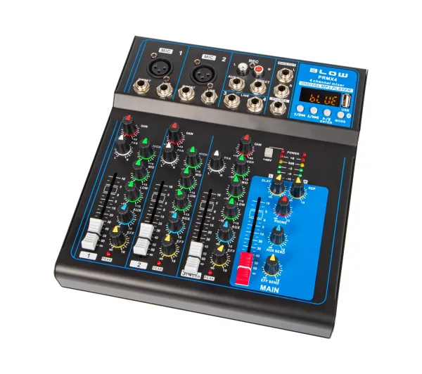 <h2>Mikser studyjny audio</h2><p>Kompaktowy mikser PRMX 4 marki BLOW dzięki rozbudowanym funkcjom doskonale sprawdzi się na scenie, w studiu nagrań, a także w wyposażeniu Dj-a. Urządzenie posiada złącze USB (Universal Serial Bus) umożliwiające odtwarzanie plików MP3 (MPEG-1 Audio Layer 3), wbudowany efekt echa oraz gniazdo typu Jack do podłączenia zewnętrznych procesorów efektów.</p><h3>Idealny dla każdego Dj-a i wodzireja</h3><p>Idealne urządzenie dla wszystkich osób które lubią komfortowo i skutecznie miksować muzykę, lub prowadzić szkolenia, prezentacje i wystąpienia. Dzięki wysokiej jakości i przystępnej cenie to doskonała alternatywa dla drogich mikserów</p>