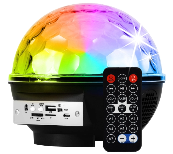 <h2>Twoje domowe centrum imprez!</h2><p>AB69S PartyBall to mobilne centrum rozrywki, które przeniesie każdą imprezę na wyższy poziom! Dzięki obrotowemu silnikowi LED (Light Emitting Diode) z regulacją prędkości oraz wbudowanym głośnikom o mocy 12W, możesz cieszyć się niezwykłym klimatem świetlnym i muzycznym dźwiękiem. Bateria 2000mAh zapewnia aż do 5 godzin zabawy, bez potrzeby częstego ładowania. Synchronizacja światła z muzyką oraz różnorodne opcje odtwarzania: Bluetooth, USB (Universal Serial Bus), microSD (micro Universal Serial Bus) sprawiają, że AB69S PartyBall to uniwersalne rozwiązanie na każdą domową imprezę, która pozostawi niezapomniane wspomnienia.</p><h2>Magiczne efekty świetlne LED (Light Emitting Diode) – 7 diod</h2><p>AB69S PartyBall wyposażony jest w 7 diod LED (Light Emitting Diode), które pozwalają na stworzenie różnorodnych, efektownych kombinacji kolorystycznych. Funkcja FLASH oraz 3 tryby muzyczne sprawiają, że światła automatycznie synchronizują się z muzyką, dostosowując się do jej rytmu. Dzięki regulowanej prędkości obrotów możesz dostosować dynamikę efektów do swojego nastroju, co tworzy energiczną, pełną emocji atmosferę, dopasowaną na różnorodne okazje.</p><h2>Mocny dźwięk i pełna synchronizacja</h2><p>Dwa wbudowane głośniki o mocy 12W (Watt) zapewniają czyste, mocne brzmienie, które bez problemu wypełni przestrzeń dźwiękiem. Synchronizator dźwięku automatycznie dopasowuje efekty świetlne do muzyki, co daje wrażenie pełnego połączenia dźwięku i efektów wizualnych. Każda piosenka staje się wizualnym spektaklem, a dzięki tym funkcjom Twoje imprezy będą miały wyjątkowy klimat i zapadną w pamięć wszystkim uczestnikom.</p><h2>Bezprzewodowa wygoda i wszechstronność</h2><p>Wbudowana bateria o pojemności 2000mAh pozwala na zabawę nawet przez 5 godzin, a możliwość ładowania z różnych źródeł, takich jak power banki, zwiększa komfort użytkowania. Dzięki opcji odtwarzania muzyki przez Bluetooth, USB (Universal Serial Bus) lub microSD (micro Secure Digital), możesz łatwo podłączyć różne urządzenia – od smartfonów po tablety i komputery. Taka wszechstronność sprawia, że AB69S PartyBall doskonale sprawdza się zarówno w domu, jak i na zewnątrz, np. podczas pikników czy spontanicznych spotkań z przyjaciółmi.</p><h2>Kontrola w Twoich rękach</h2><p>AB69S PartyBall posiada pilot zdalnego sterowania, który umożliwia pełną kontrolę nad urządzeniem. Możesz łatwo zmieniać kolory świateł, tryb dźwięku oraz prędkość obrotu, co pozwala na dostosowanie atmosfery do każdej sytuacji.</p><h2>Wymiary i waga</h2><p>Akcesoria w zestawie: pilot zdalnego sterowania, kabel USB-A (Universal Serial Bus Type-A) - microUSB (micro Universal Serial Bus). Jeśli chcesz wynieść zabawę na jeszcze wyższy poziom, warto dokupić dodatkowe produkty MUSICMATE, np. Zestaw Karaoke. Dzięki temu stworzysz kompletną strefę rozrywki — połączenie dynamicznych świateł i karaoke sprawi, że każde spotkanie z przyjaciółmi stanie się niezapomnianym przeżyciem. Produkt objęty jest również gwarancją, co zapewnia bezpieczeństwo i spokój użytkowania.</p>