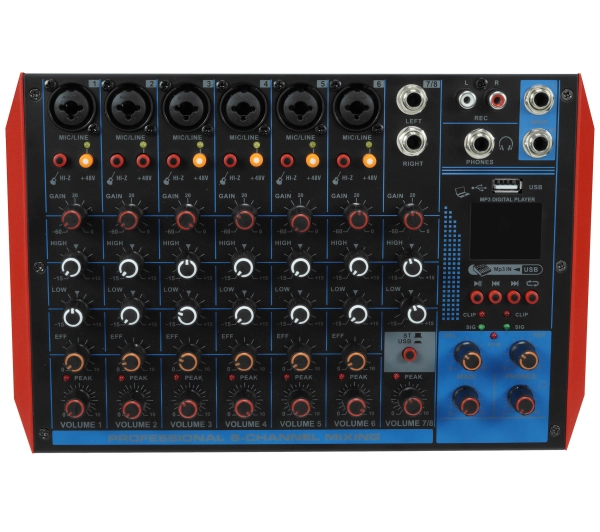 Informacje dodatkowe: Bluetooth, wyświetlacz, Gniazda wejściowe: 6 x LINE/MIC (Jack 6.3 mm/XLR) z obsługą +48V Phantom i HI-Z, 2 x Jack 6.3 mm, USB typu A, Gniazda wyjściowe: 2 x Jack 6.3 mm (L/R), wyjście słuchawkowe Jack 6.3 mm, wyjście REC RCA L/R do nagrywania