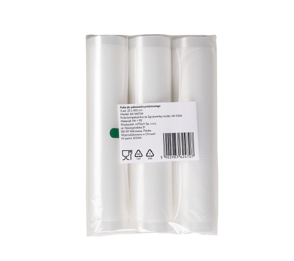 <h2>✅ Idealne dopasowanie do pakowanego produktu</h2><p>Folie do pakowania próżniowego to bardzo wygodne rozwiązanie, gdy chcemy dokładnie dobrać rozmiar opakowania do produktu spożywczego. Dzięki możliwości indywidualnego przycięcia do wymiarów produktu możemy pakować zarówno małe porcje jedzenia, jak i te naprawdę duże. W ten sposób możesz wygodnie przechowywać próżniowo nawet duże porcje mięsa lub ryby. W zestawie otrzymasz 3 sztuki folii o wymiarach 20x300 cm Dzięki nim zaoszczędzisz czas oraz środki na zakupy. Folia idealnie pasuje do obydwu modeli zgrzewarek Huslog</p><h2>✅ Ochrona żywności</h2><p>Próżniowe pakowanie żywności pozwala wydłużyć jej przydatność do spożycia nawet 5-krotnie! Technologia pakowania próżniowego chroni żywność przed bakteriami i pleśnią. Dzięki folii do pakowania próżniowego możesz wygodnie przechowywać żywność. Koniec z marnowaniem jedzenia i bałaganem w lodówce czy zamrażarce! Daje to gwarancję prawidłowego pakowania próżniowego produktów spożywczych.</p><h2>✅ Nie tylko do przechowywania</h2><p>Pakowanie próżniowe z wykorzystaniem folli do zgrzewarki to zastosowanie nie tylko do dłuższego przechowywania żywności. Otwórz się także na innowacyjną metodę gotowania, jaką jest sous-vide, inaczej slowcooking. Metoda ta polega na gotowaniu w zamkniętej próżniowo folii, w określonej temperaturze, nie przekraczającej 100ºC. Powolna obróbka pozwala zachować smak i aromat potraw, nadając im jednocześnie delikatnej struktury.</p><h2>✅ Specyfikacja produktu</h2><ul> <li>Model Ak-540134</li> <li>Wymiary: 20x300 cm</li> <li>Materiał wykonania: Polietylen</li> <li>Ilość: 3 sztuki</li></ul>