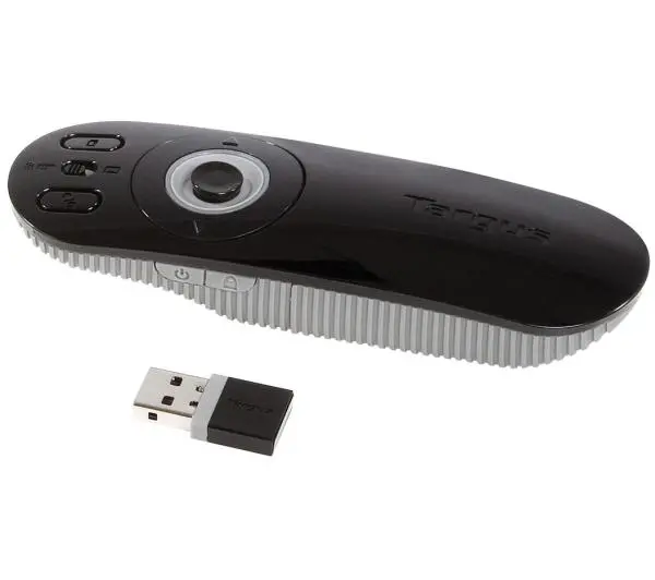 Opis: Bezprzewodowy prezenter ze wskaźnikiem laserowym do obsługi PowerPoint lub Apple Keynote oraz możliwością kierowania kursorem. Pozwala na łatwą obsługę prezentacji. Ultra mały odbiornik USB z gniazdem do jego przechowywania w komorze baterii,