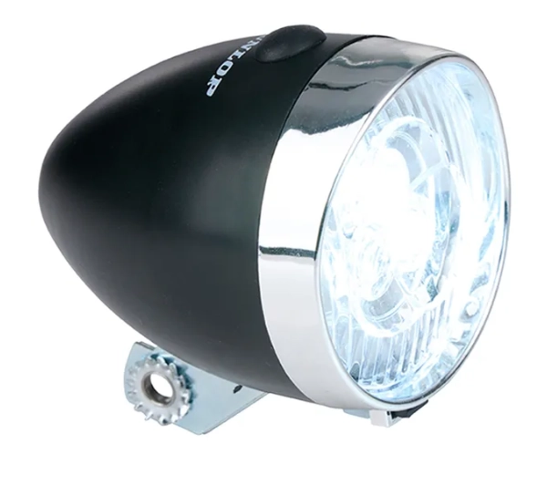 <h2>Przednia lampa rowerowa Dunlop Light 3 - styl i bezpieczeństwo</h2><h3>Klasyczny design i solidne mocowanie</h3><p>Lampa Dunlop nawiązuje wyglądem do tradycyjnych lamp rowerowych, nadając rowerowi elegancki, retro charakter. Montaż na widelec zapewnia stabilne i pewne zamocowanie, a solidna konstrukcja odporna na warunki atmosferyczne gwarantuje długotrwałe użytkowanie.</p><h3>Jasne oświetlenie i uniwersalne zastosowanie</h3><p>Trzy diody LED (Light Emitting Diode) emitują energooszczędne, białe światło, które skutecznie oświetla drogę po zmierzchu. Lampka sprawdzi się doskonale w rowerach miejskich, klasycznych i retro, zwiększając widoczność oraz bezpieczeństwo podczas jazdy.</p>