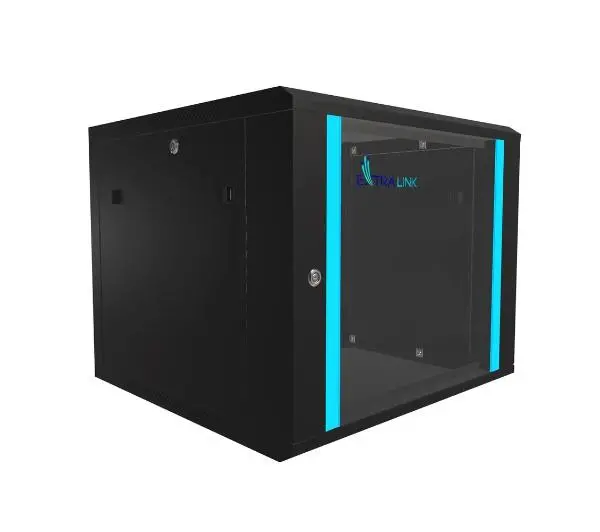 <h2>Szafa rack marki EXTRALINK w kolorze czarnym - 9U, 600 × 600</h2><p>Szafa rackowa firmy Extralink jest dedykowana do montażu naściennego w biurach, serwerowniach sieciowych oraz pomieszczeniach sterowania instalacjami CCTV. Ściany zewnętrzne wykonane są z walcowanej na zimno blachy stalowej. Posiadają również szybę ze szkła hartowanego, a drzwi mogą otwierać się zarówno na lewą, jak i prawą stronę.</p><h2>Wizualnie oznaczona wysokość szafy</h2><p>Szyny pionowe mają wyraźne oznaczenie wysokości wynoszące 9U (z ang. unit), a łączna wysokość szafy to 50,5 cm.</p><h2>Prosty sposób na zdejmowanie ścian bocznych</h2><p>Zapięcia na bokach pozwala na łatwe usunięcie ścian bocznych. W zestawie znajdują się zamki i klucze.</p><h2>Sufit szafy dostosowany do instalacji wentylatorów</h2><p>Na suficie szafy zostały wyznaczone 2 punkty do zamocowania wentylatorów w celu poprawy cyrkulacji powietrza, umieszczono tam również dodatkowy otwór na przeprowadzenie kabli.</p><h2>Ilustracja przedstawiająca strukturę szafy</h2><p> </p><h2>Główne cechy</h2><ul> <li>Standardowy montaż 19’’, spawana rama, niezawodna konstrukcja</li> <li>Konstrukcja ramy do samodzielnego montażu - łatwa w przenoszeniu i transporcie, co obniża koszty związane z wysyłką</li> <li>Montaż ścienny lub w pozycji stojącej</li> <li>Łatwy montaż (patent)</li> <li>Zdejmowane panele boczne</li> <li>Otwory do wprowadzenia kabli zarówno na górnej pokrywie, jak i na dolnym panelu</li> <li>Przednie drzwiczki ze szkła hartowanego z kątem obrotu przekraczającym 180 stopni</li></ul><h2>Specyfikacja</h2><ul> <li> Wysokość szafy 9U </li> <li> Dołączone śruby Tak </li> <li> Szerokość 600 mm </li> <li> Głębokość 600 mm </li> <li> Wysokość 505 mm </li> <li> Kolor Czarny </li> <li> Konstrukcja drzwi przednich Szkło/stal </li> <li> Zamek Tak </li> <li> Zdejmowalne drzwi przednie Tak </li></ul>