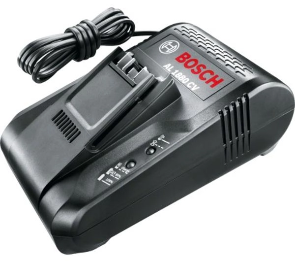Szybka wielonapięciowa ładowarka AL1880CV Bosch (1600A011TZ) jest przeznaczona do ładowania akumulatorów litowo-jonowych systemu Power for ALL 18V i wszystkich akumulatorów litowo-jonowych 14,4V z oferty Home&Garden. Ładowarka cechuje się bardzo szybkim ładowaniem, przykładowo akumulator o pojemności 1,5Ah jest naładowany w 80% w 12 minut. Charakterystyka produktu:<ul> <li>Ładowarka AL 1880 CV posiada wskaźnik "Ready to Go", który informuje o gotowości akumulatora do użycia (naładowany w 80%)</li> <li>Wyposażona w aktywne chłodzenie powietrzem w przypadku ładowania akumulatorów wyposażonych w otwory wentylacyjne</li> <li>Inteligentny i ekonomiczny proces ładowania akumulatorów dowolnej pojemności wydłuża żywotność akumulatora</li></ul>Dane techniczne:<ul> <li>Napięcie ładowanych akumulatorów: 14,4-18V</li> <li>Prąd ładowania: 8A</li> <li>Czas ładowania przy 1,5Ah 80/100%: 12/27min</li> <li>Czas ładowania przy 2,0Ah 80/100%: 22/30min</li> <li>Czas ładowania przy 2,5Ah 80/100%: 25/36min</li> <li>Czas ładowania przy 3,0Ah 80/100%: 30/46min</li> <li>Czas ładowania przy 4,0Ah 80/100%: 27/35min</li> <li>Czas ładowania przy 6,0Ah 80/100%: 45/62min</li> <li>Masa: 0,7kg</li></ul>