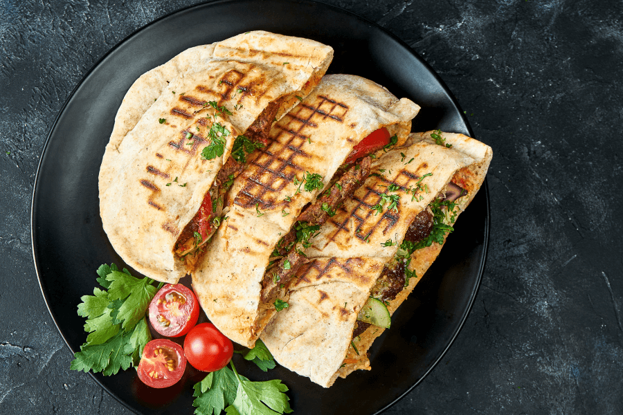 Chlebek pita świetnie sobie radzi także jako propozycja dla mięsożerców. Jej pojemność pozwala na włożenie do niej nawet większych kawałków mięsa, które można uzupełnić o warzywa i sosy. Ta naprawdę duża kanapka na ciepło z opiekacza może zastąpić lunch.