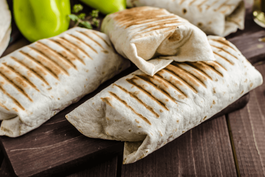 Na placek tortilli połóż dwa duże plastry sera. Następne składniki układaj na środku placka: garść sałaty, łyżkę kukurydzy, połowę pokrojonego w plastry lub kostkę awokado oraz pomidora. Kilka pasków świeżej papryki, łyżkę pokrojonego w kostkę tofu – może być wcześniej przesmażone z sosem sojowym i sezamem. Następnie lekko zawiń dwie krawędzie, aby stanowiły zabezpieczenie przed wysypywaniem się środka, i mocno naciągaj i zawijaj jednocześnie prostopadłą do nich krawędź, dociskając zawartość. Tak zawiniętą tortillę natychmiast wkładamy do nagrzanego opiekacza z powierzchnią grillową. Gotową tortillę można posmarować ulubionym sosem i oprószyć pietruszką.