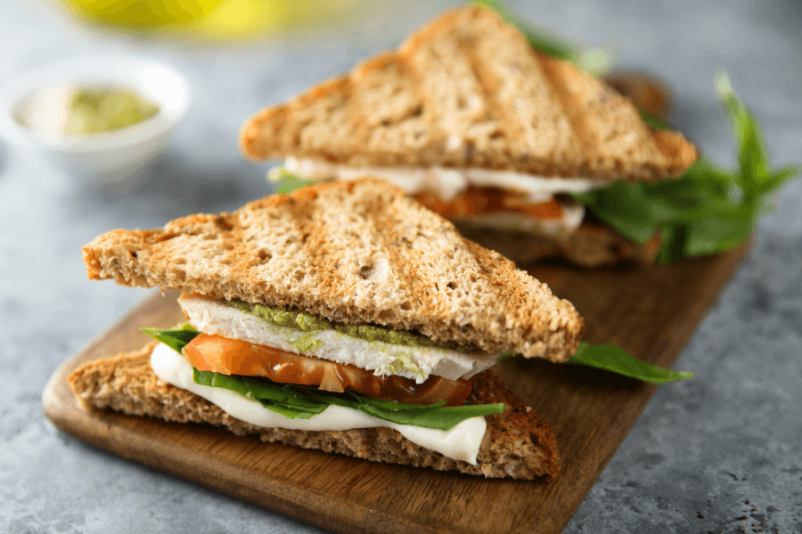 Bułkę typu panini lub jej zamiennik przekrój wzdłuż i posmaruj obie połówki pesto. Następnie układaj na jednej z nich na przemian pomidora i mozzarellę oraz plaster wędzonego kurczaka lub wędzonego tofu. Dołóż kilka listków rukoli i posiekane oliwki. Opiecz na płytach grillowych w zamkniętym opiekaczu.
