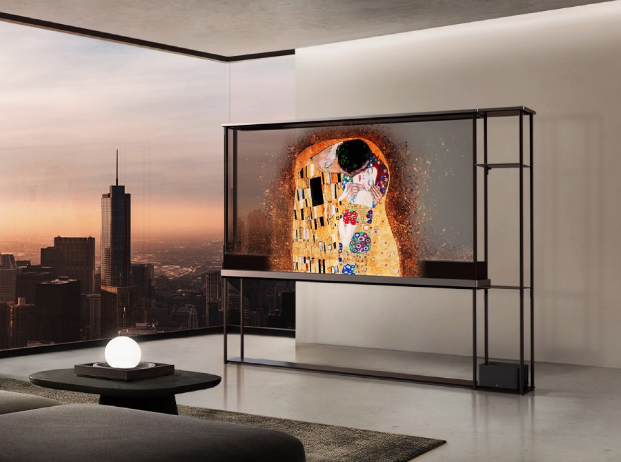 To pierwszy na świecie bezprzewodowy przezroczysty telewizor OLED. LG SIGNATURE OLED T umożliwia wyświetlanie treści tylko na fragmencie 77-calowego ekranu, pozostała jego część pozostaje przezroczysta. Dzięki temu może harmonijnie komponować się z wnętrzem salonu, gdy jest wyłączony. Tym bardziej że może być umieszczony w wolnostojącej konstrukcji imitującej mebel.