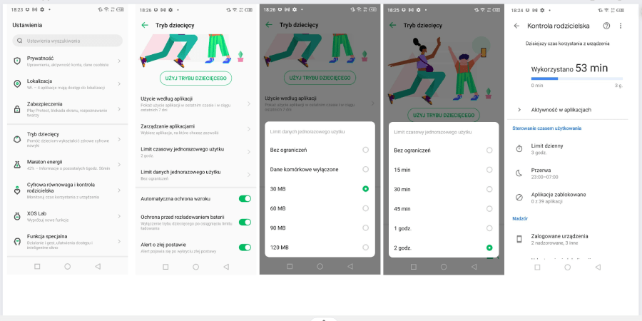 Dodatkowo w tym trybie mamy takie opcje, jak: Automatyczna ochrona wzroku, Ochrona przed rozładowaniem baterii oraz Alert o złej postawie. W ustawieniach smartfona jest także opcja Cyfrowa równowaga i kontrola rodzicielska, która umożliwia dodatkowe zabezpieczenia. To opcja, która konfiguruje kontrolę z Google Family Link. Rodzic nie musi zaglądać do telefonu dziecka, ale otrzymuje informacje o aktywnościach dziecka bezpośrednio na swój telefon. Ja miałam już tę opcję, więc nie musiałam nic zmieniać, wystarczyło włożyć kartę SIM i wszystkie ustawione zabezpieczenia były aktualne.