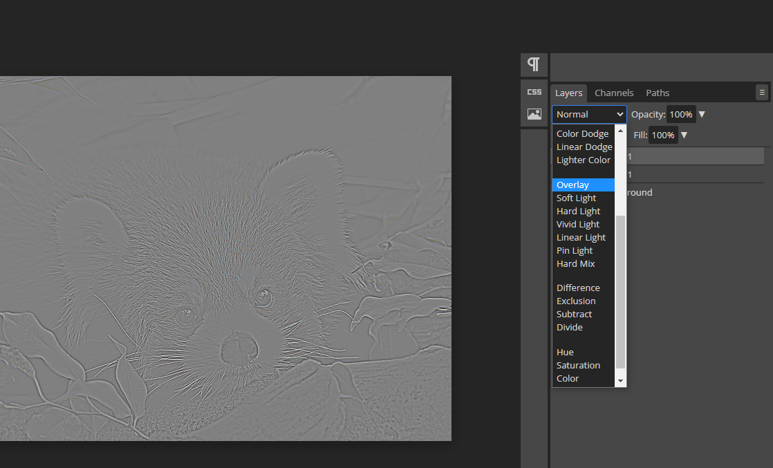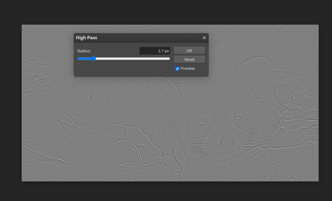 Drugim często wykorzystywanym sposobem na to, jak wyostrzyć zdjęcie, jest zmiana trybu mieszania. Wystarczy zduplikować warstwę (Ctrl + J) i wybrać Filter > Other > High pass (Filtr górnoprzepustowy). Zdjęcie zostanie wypełnione szarym kolorem, a krawędzie zostaną wyodrębnione. Po wybraniu odpowiedniego promienia należy zmienić tryb mieszania dla warstwy na Overlay (Nakładka).