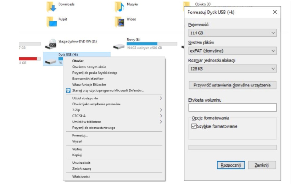 Sprawdź, jak sformatować pendrive na komputerze lub laptopie z systemem Windows 7/8/10 lub nowszym. Pamiętaj, by najpierw przerzucić ważne dane na inny dysk przenośny lub komputer, żeby ich nie utracić: