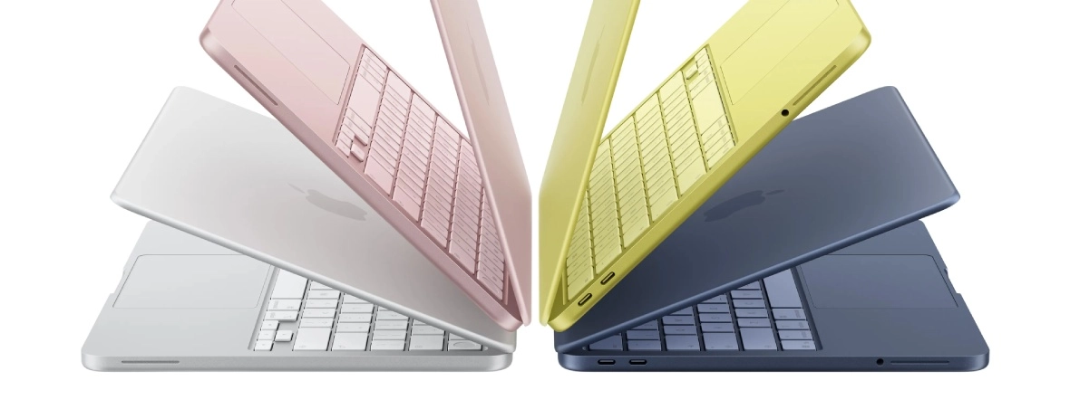 Nowy MacBook Neo jest zrobiony w całości z aluminium i ma charakterystyczne, miękko zaokrąglone rogi. Jest dostępny w czterech odcieniach: Indigo (ciemnoniebieski), Blush (jasnoróżowy), Citrus (jasnożółty) i Silver (srebrny). Co ciekawe, kolory te przeniesiono również na klawiaturę Magic Keyboard, tylko w jaśniejszej tonacji.