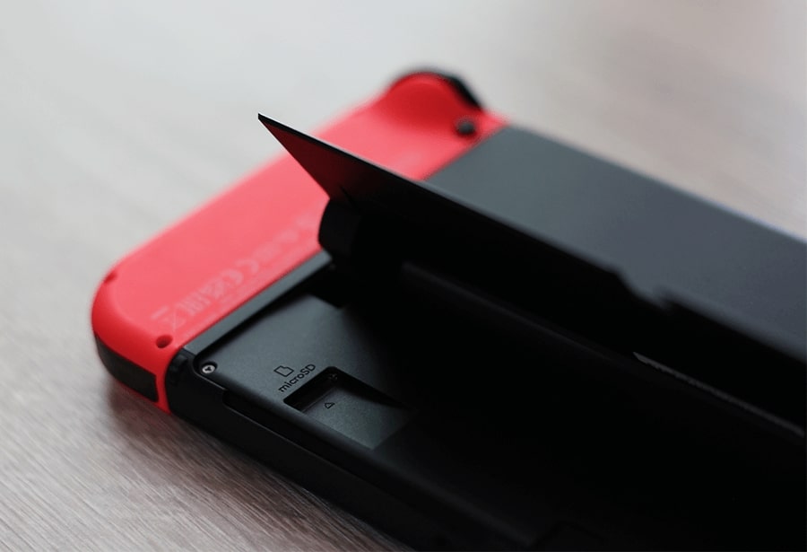 „Uwielbiam stabilność podstawki w moim Switchu V2” – nie powiedział nikt nigdy. Nóżka w starym modelu jest jednym z najsłabszym elementów konsoli. W testowanym Switchu OLED otrzymaliśmy więc szeroką podstawkę w całości wykonaną z metalu. Kąt nachylenia można regulować dowolnie, co jest ogromną wygodą dla grania w trybie tabletop (czyli konsola postawiona na płaskiej powierzchni).