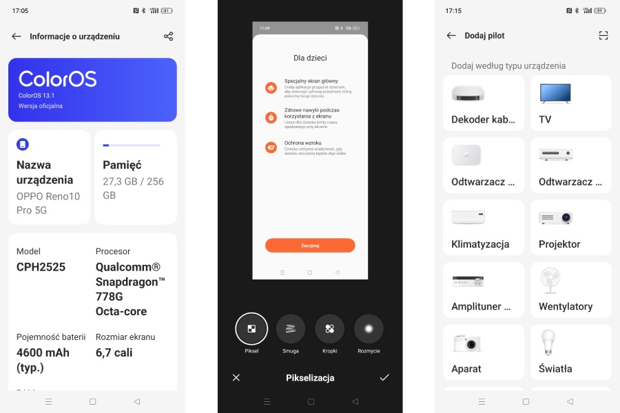 OPPO Reno10 Pro 5G działa na systemie Android 13, z firmową nakładką producenta ColorOS 13. ColorOS jest przyjazny i intuicyjny. Ujął mnie między innymi powiadomieniami dotyczącymi optymalizacji działania urządzenia, na przykład – wyłączenia aplikacji działających w tle. Nie są zbyt częste i okazują się przydane. Także podczas przeglądania ustawień systemowych u dołu okna wyświetlają się sugestie ułatwiające trafienie do potrzebnych funkcji. Podobnie aplikacja aparatu pokazuje podpowiedzi, kiedy warto się zbliżyć do obiektu czy wyprostować kadr. Wszystko to sprawia, że korzystanie z telefonu jest bezstresowe i przyjemne.