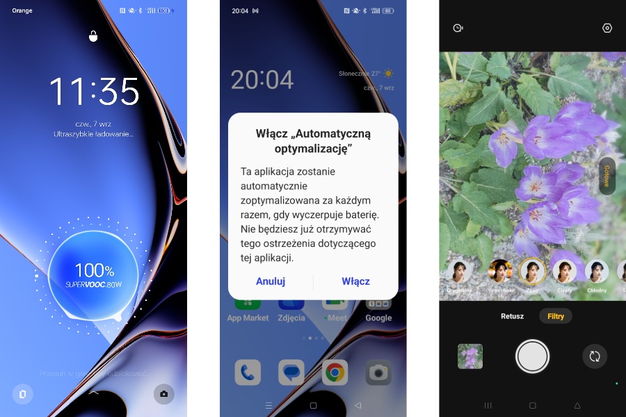 OPPO Reno10 Pro 5G faktycznie ładuje się od zera do pełna w niecałe pół godziny. W kilka minut można go naładować tak, by wytrzymał spokojnie cały dzień, oczywiście przy mniej intensywnym korzystaniu. Zdarzało mi się ładować go co dwa dni i rzadziej, ale tu dużo zależy od tego, ile miałam dla niego zadań w ciągu dnia.