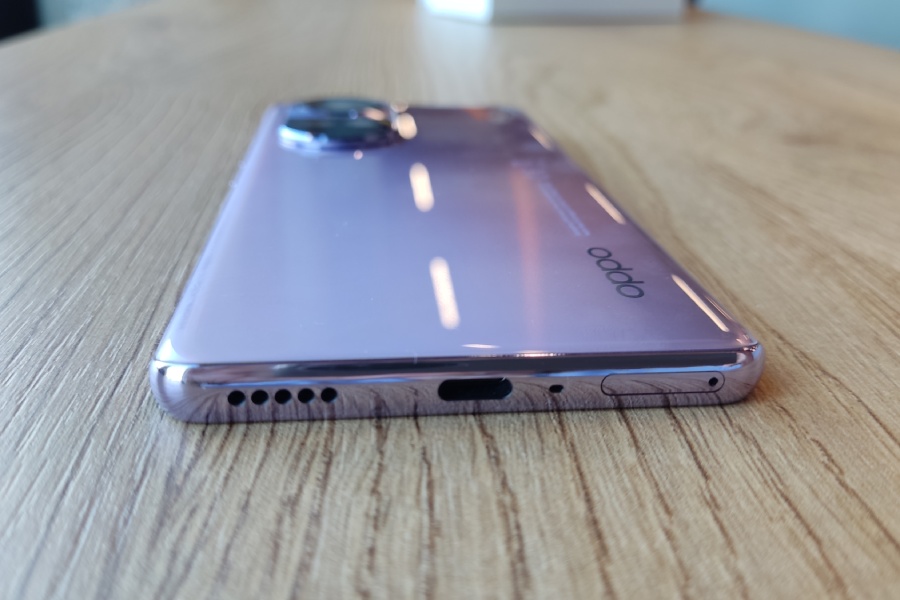 Ten model jest dostępny w dwóch wersjach kolorystycznych – fioletowej, którą dostałam do testów, i szarej (ten kolor został nazwany przez producenta „gwiezdny szary”). Tył telefonu w wersji szarej ma wykończenie OPPO Glow – jest metaliczny, jakby pokryty warstwą szkła, ale nie przyjmuje odcisków palców i jest odporny na zabrudzenia. W wersji fioletowej tył również jest starannie wykończony i się nie brudzi. Boki są obłe, ładnie, łagodnie zagięte i bardzo gładkie. Tak gładkie, że nie mogłam dotykiem zlokalizować slotu na kartę SIM (jest umieszczony na dolnej krawędzi, a nie z boku, do czego jestem przyzwyczajona).