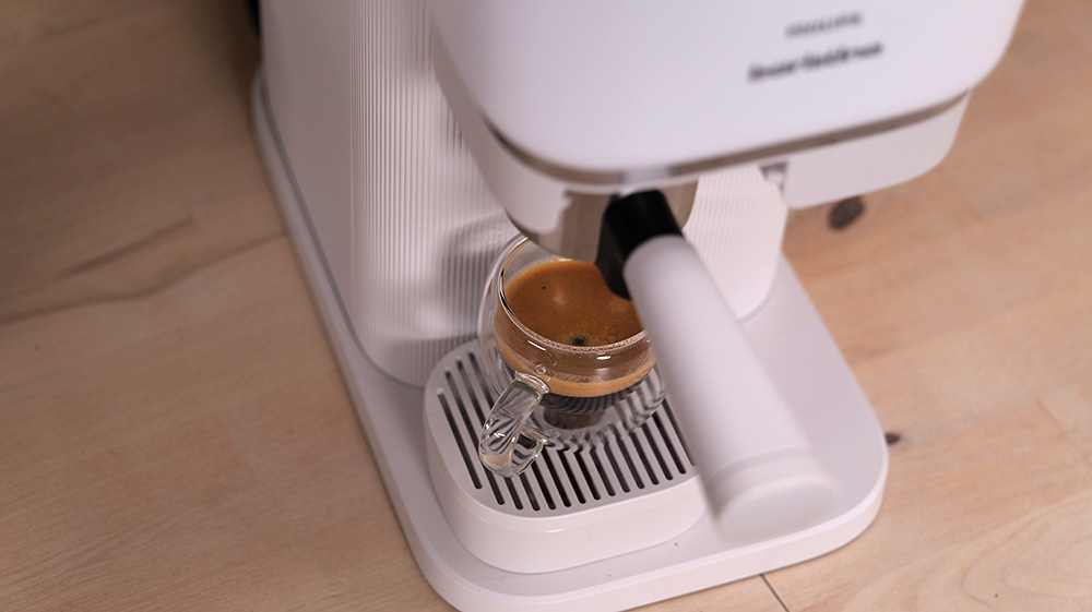 I tak, i nie. Kawa, jaką przygotowuje, jest aromatyczna i intensywna, choć wydaje się mieć trochę za dużo wody. Zarówno w espresso, jak i w lungo. Jest to jednak naprawdę drobnostka, bo kawa jest pyszna, pełna aromatu i smaku. Poza tym nie musisz korzystać z ustawień fabrycznych, możesz je zmodyfikować i dopasować ilość wody. Jeśli tylko masz dobre ziarna, to nie poczujesz różnicy między kawą przygotowaną przez Baristinę a taką z popularnych sieciowych kawiarni. A jeśli pijesz kawy z mlekiem, to przy odrobinie wprawy możesz osiągnąć efekt porównywalny z kawiarnianym – wystarczy, że odpowiednio spienisz mleko. Robienia wzorków też możesz się nauczyć.