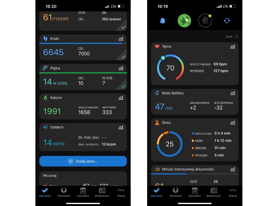 Garmin Connect jest rozbudowaną, ale przejrzystą i intuicyjną w obsłudze aplikacją. Oferuje ogromną ilość informacji i analiz dotyczących naszych aktywności ruchowych, do których bardzo łatwo dotrzeć. Znajdziesz tam kompleksowe plany treningowe (które możesz dostosowywać do swoich preferencji), animacje wykonywania ćwiczeń, statystyki wydajności (m.in. pułap tlenowy), stan wytrenowania, możliwość monitorowania czasu używania butów i wiele więcej. Jest ich tyle, że nawet nie będę próbował ich tu wszystkich wymienić.