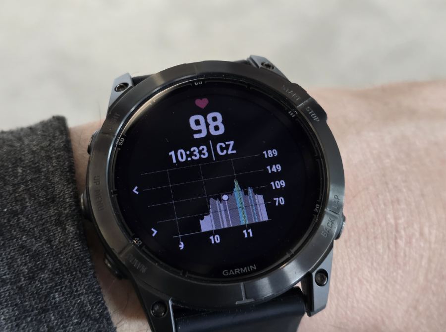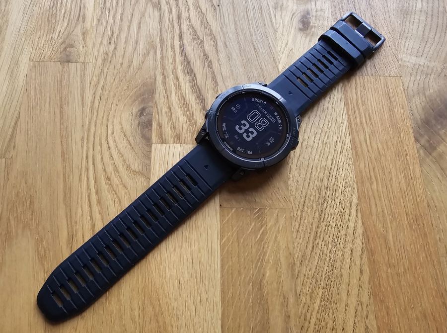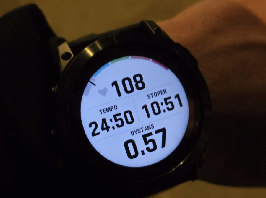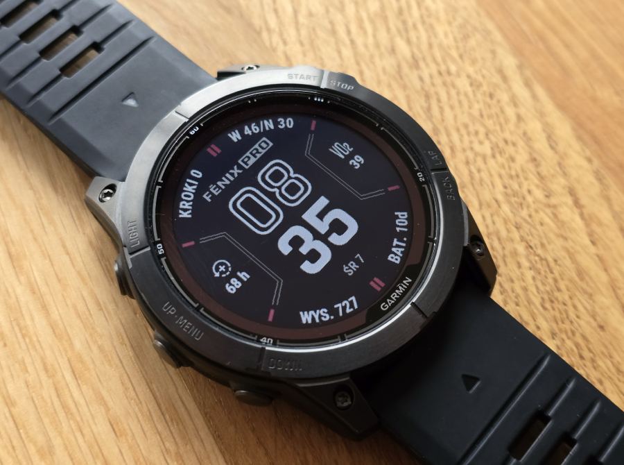 Większy rozmiar ma tę zaletę, że pozwala zastosować w urządzeniu duży ekran. Garmin Fenix 7X Pro Solar ma kolorowy wyświetlacz MIP o przekątnej 1,4 cala. Aby się nie uszkodził, przykryto go wytrzymałym i odpornym na zarysowania szafirowym szkłem. Jest czytelny, choć podczas przebywania w słabiej oświetlonych wnętrzach zdarzało się, że miałem problem z odczytaniem informacji, jeśli nie podniosłem ręki bliżej głowy lub nie włączyłem podświetlenia (w ustawieniach można jednak włączyć automatyczne podświetlanie ekranu przy ruchu nadgarstka i czas przez jaki ma być podświetlony). Kolory są trochę przygaszone, ale w niczym mi to nie przeszkadzało.