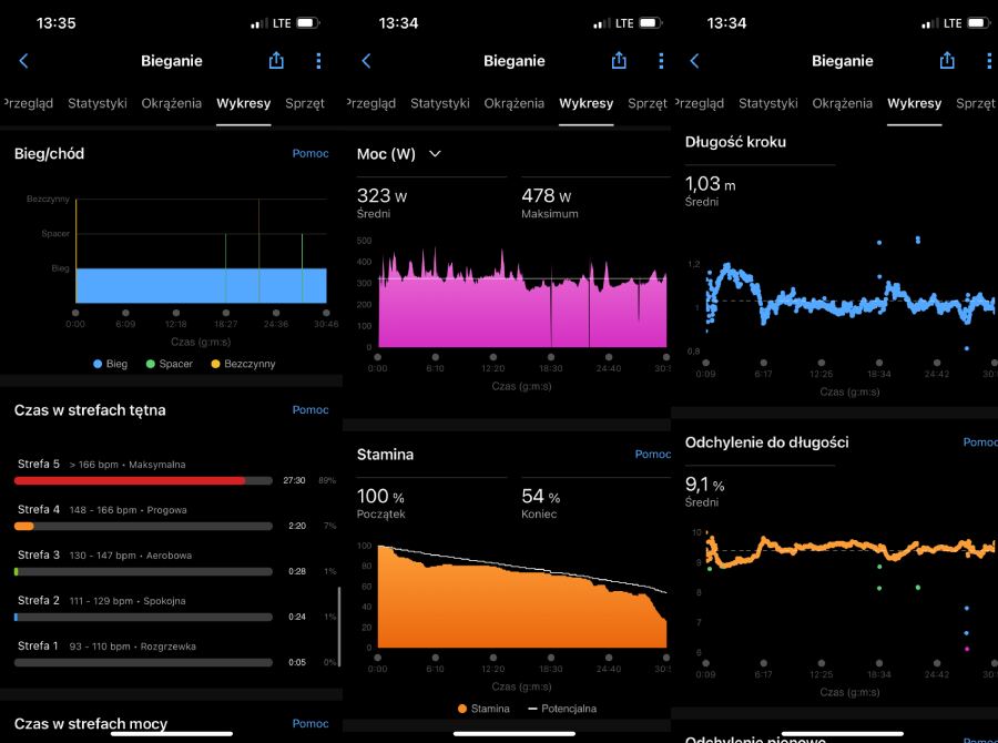 Zegarek bez problemu złapał sygnał GPS i mogłem zacząć jogging. Duży i czytelny ekran pozwalał szybko, kątem oka zobaczyć, jak wyglądają poszczególne parametry – na głównym ekranie są to dystans, czas, tempo oraz tętno, ale można oczywiście przechodzić na kolejne ekrany, a także dostosowywać do swoich preferencji to, co ma być tam wyświetlane. Można także śledzić trasę na dostępnej mapie i jednym wciśnięciem przycisku zaznaczać sobie dystans okrążenia. Po biegu mogłem wszystko dokładniej przeanalizować, przeglądając wiele niezwykle szczegółowych statystyk i wykresów w aplikacji. A także dowiedzieć się, kiedy powinienem podejść do kolejnego treningu.