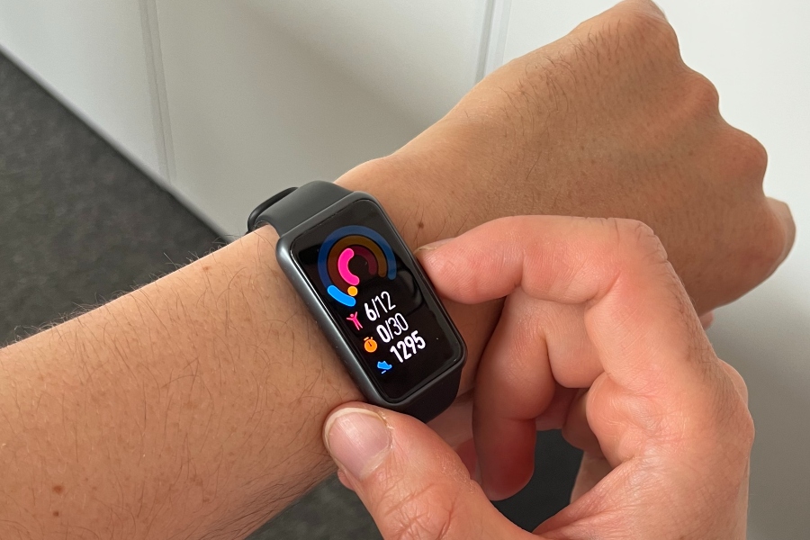 Ekran aktywuje się poprzez wciśnięcie przycisku lub też ruch nadgarstka. Stosunek wyświetlacza do całości obudowy wynosi ponad 72%, bardzo przyzwoicie. Dotykowi nie mogę niczego zarzucić. Mimo stosunkowo niewielkiego ekranu działa bardzo precyzyjnie, nie miałem problemu z przypadkowym włączeniem jakiejś funkcji. Przesuwanie aplikacji i ekranów odbywa się bardzo płynnie. Możliwe jest także włączenie funkcji Always-On-Display. Ogółem ekranowi Huawei Band 7 wystawiłbym 5+ (w skali ocen szkolnych).