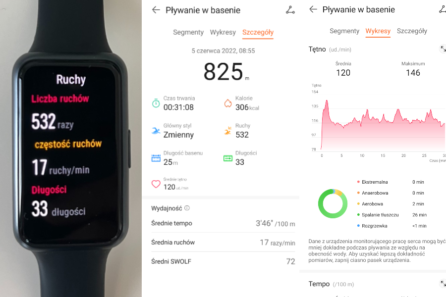 Huawei Band 7 może mierzyć aż 96 rodzajów ćwiczeń sportowych. Od kolarstwa i biegów po mniej oczywiste, jak np. skakanie na skakance. Choć jeśli chodzi o tę pierwszą aktywność, to warto dodać, że jest ona dostępna wyłącznie dla smartfonów Huawei z EMUI 5.0 lub nowszym oraz smartfonów Apple z iOS 9.0 lub nowszym. Dla każdego ćwiczenia możesz też ustawić konkretny cel, który ma być osiągnięty. W zależności od sportu może to być: dystans, czas, kalorie czy długości basenu w przypadku pływania. Opaska ma standard 5 ATM, więc możesz bez jakichkolwiek obaw zanurzyć ją w wodzie. Muszę zaznaczyć, że nie ma wbudowanego GPS (musi korzystać z tego ze sparowanego smartfona), co jednak w przypadku budżetowego smartbandu nie jest wadą.