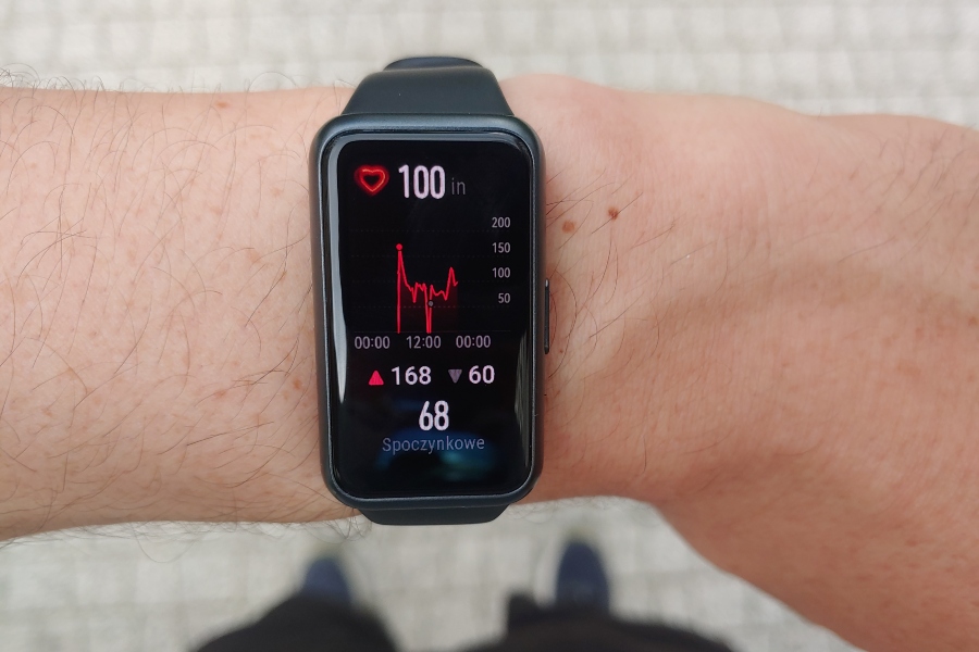 Huawei Band 7 ma kolorowy, delikatnie zakrzywiony ekran o przekątnej 1,47 cala. Wykonany został w technologii AMOLED. Podobnie jak inne inteligentne opaski i smartwatche Huawei jego czytelność jest rewelacyjna. Kolory są żywe i nasycone, a czerń – głęboka. Również na zewnątrz – w pełnym słońcu – wszystko, co wyświetla, jest bardzo dobrze widoczne.