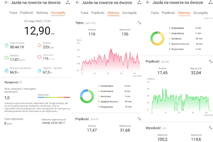 Z dostępnych trybów sportowych przetestowałem jazdę na rowerze, czy też kolarstwo, jak jest ona nazwana w zegarku. GPS uruchamia się bardzo szybko i bardzo dokładnie rejestruje trasę. Nic dziwnego, jest to zaawansowany GPS – pięciosystemowy i dwuzakresowy. Huawei Watch GT 3 Pro może podawać w czasie treningu komunikaty głosowe – jednak wyłącznie w języku angielskim. Po zakończonej aktywności dostałem szczegółowy raport, który uwzględniał nie tylko tętno, średnią prędkość czy pokonaną wysokość, ale także m.in. czas potrzebny na regenerację.