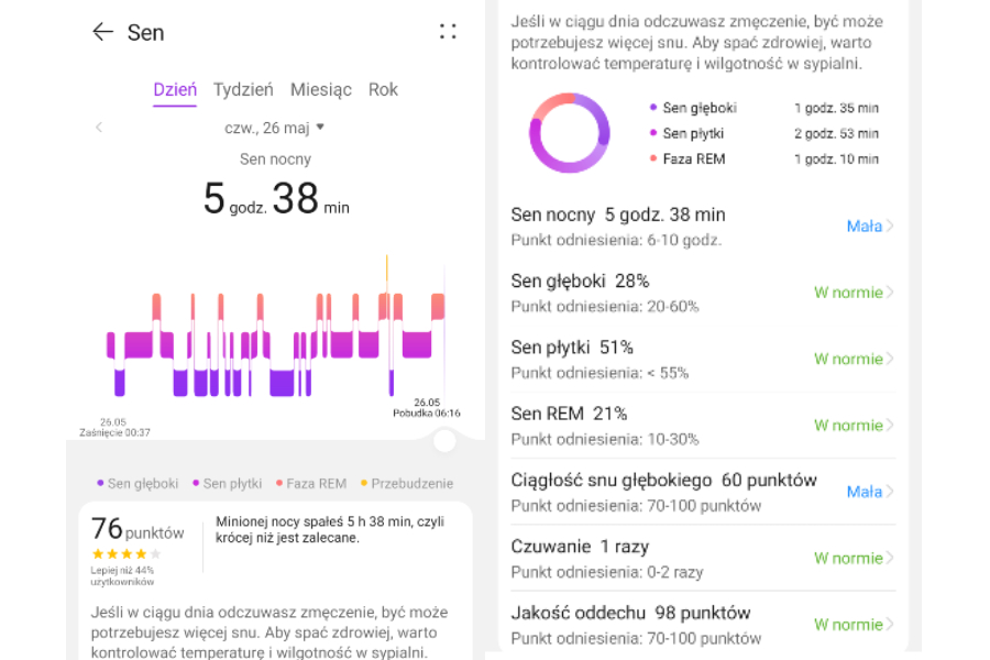 Możesz również przeprowadzić analizę swojego snu. Aplikacja nie tylko podsumuje, ile czasu trwała każda z jego faz, ale także określi, czy jest zgodna z normą, czy np. przydałaby się w tym względzie poprawa. W aplikacji dowiesz się także, jak wypadasz na tle innych użytkowników.