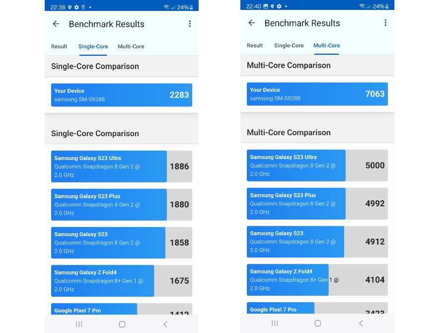Sercem Samsung Galaxy S24 Ultra jest najnowszy procesor Qualcomm Snapdragon 8 Gen 3 dla Galaxy. Dopisek „dla Galaxy” oznacza, że w porównaniu ze standardowym procesorem jest on delikatnie podkręcony dla flagowców Samsung. To bardzo wydajny czip, co potwierdzają testy, które zrobiłem w aplikacji Geekbench 6. Na poniższych screenach widać różnicę pomiędzy najnowszą a poprzednią generacją Ultry.