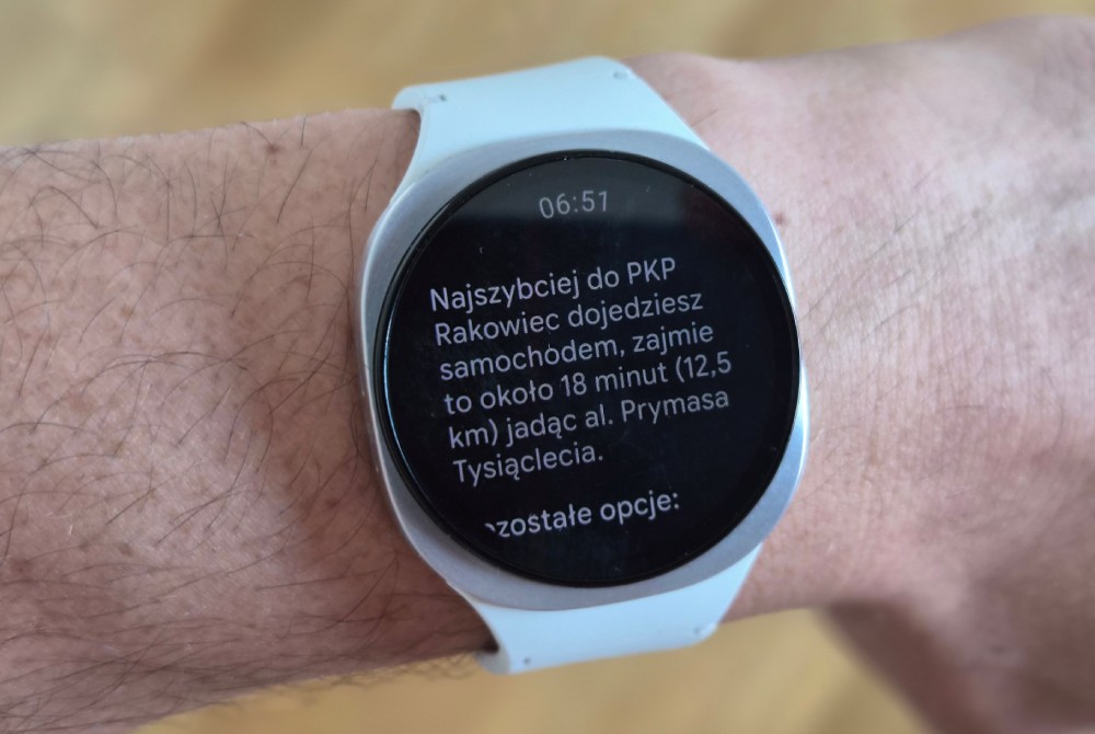 Zadawałem mu ogólne pytania – np. o to, jaka będzie pogoda w ten weekend w Warszawie – i otrzymałem odpowiedź głosową, a dodatkowo na ekranie zegarka włączyła się aplikacja Pogoda. Prosiłem o nawigowanie: „Poprowadź mnie do najbliższej kawiarni”, i dostawałem informacje, jaka to kawiarnia i jak daleko się znajduje, a także link do uruchomienia trybu nawigowania w aplikacji Mapy. Gemini może też inicjować funkcje telefonu, a nawet łączyć je ze sobą, np. powiedziałem: „Rozpocznij bieg na 5 km i odtwórz moją playlistę Trening”, i uzyskałem to, co chciałem. Mogłem też podyktować wiadomość tekstową i od razu poprosić o jej wysłanie.