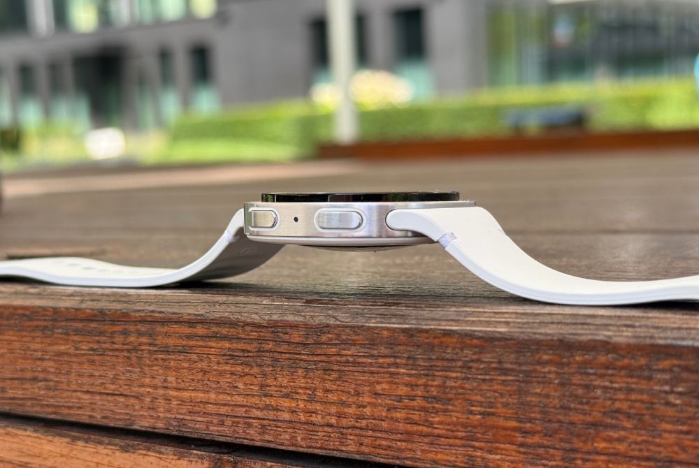 Mimo wspomnianej wyżej zmiany w designie Galaxy Watch8 wciąż wygląda jak nowoczesny, minimalistyczny inteligentny zegarek. Na jednym boku wykonanej z Armor Aluminum obudowy znajdują się mikrofon i głośnik, a na drugim – dwa płaskie przyciski (nie ma obrotowej koronki). Zegarek jest też wytrzymały – ma certyfikat potwierdzający standard militarny MIL-STD-810H. Niestraszne mu więc przypadkowe zahaczenie czy uderzenie we framugę lub coś innego. Ma też stopień ochrony 5 ATM i IP68, jest więc także pyło- i wodoodporny – możesz bez obaw pływać z nim czy brać prysznic.