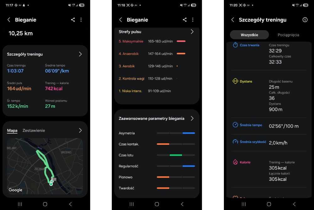 Wbudowany GPS został ulepszony do śledzenia dwuczęstotliwościowego (L1+L5), co poprawia dokładność lokalizacji w trudnych warunkach (takich jak ulice miast lub szlaki pod gęstym drzewostanem), a tym samym zapewnia bardziej precyzyjne pomiary tempa i odległości dla aktywności na świeżym powietrzu. Obsługuje import tras GPX i nawigację z do miejsca startu, jeśli zboczysz ze szlaku (choć dla użytkowników, którzy uwielbiają ekstremalne wycieczki w teren lepszym wyborem może być Galaxy Watch Ultra – test tego zegarka również możesz przeczytać u nas).