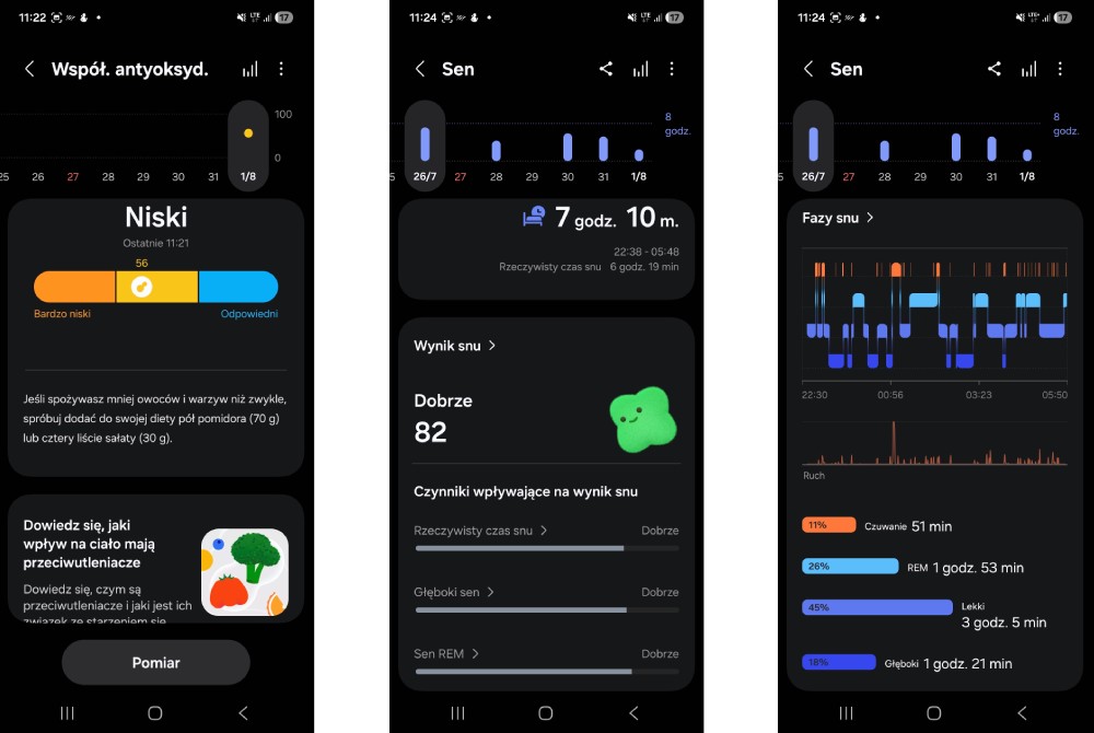 Galaxy Watch8 to pierwszy na świecie smartwatch, który może szacować poziom przeciwutleniaczy (antyoksydantów) w organizmie. Za pomocą czujnika optycznego mierzy stężenie karotenoidów w skórze (poprzez przyłożenie kciuka do czujnika), aby ocenić, ile przeciwutleniaczy tego typu przyjmujesz wraz z dietą. Jeśli poziom antyoksydantów w twoim ciele jest niski, zegarek może sugerować jedzenie większej ilości owoców i warzyw. Mówiąc inaczej, mierzenie poziomu przeciwutleniaczy ma zachęcać użytkownika Galaxy Watch8 do zdrowego odżywiania bez konieczności samodzielnego rejestrowania każdego posiłku.