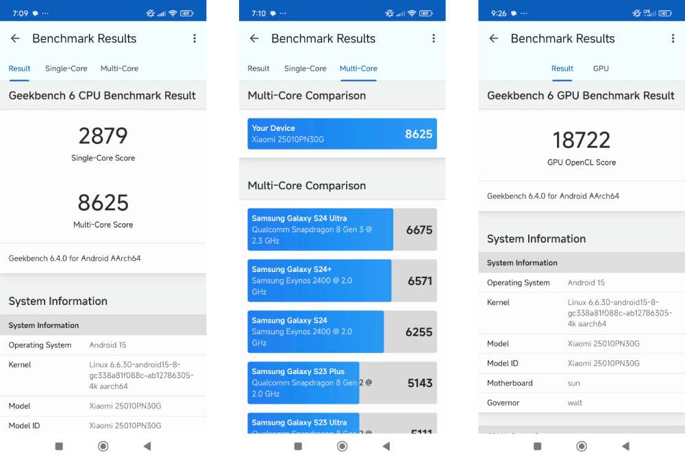 Xiaomi 15 Ultra napędza najnowszy topowy układ firmy Qualcomm, czyli Snapdragon 8 Elite. Zapewnia znakomitą wydajność CPU i GPU, co potwierdzają poniższe screeny z Geekbench 6, jednego z najpopularniejszych benchmarków. Do tego dochodzą 16 GB ultraszybkiej pamięci RAM LPDDR5X i błyskawiczna pamięć masowa UFS 4.0. Efekt? Absolutnie bezkompromisowa szybkość działania i znakomita wielozadaniowość.