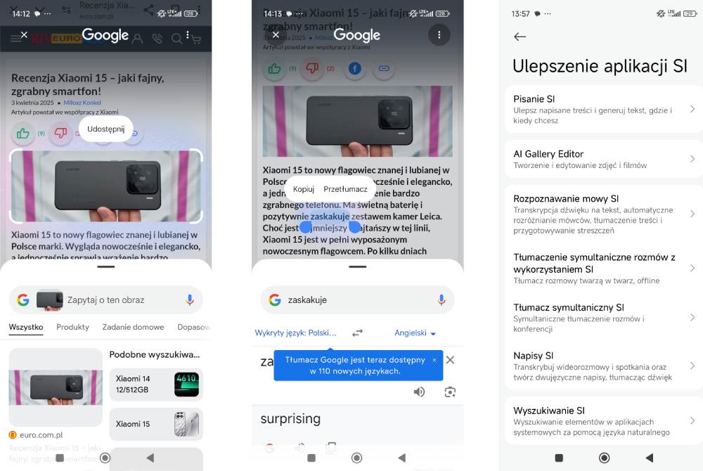 Dostępna jest także funkcja Zakreśl, aby wyszukać (Circle to Search), która umożliwia szybkie otrzymywanie informacji o zaznaczonym palcem na ekranie obiekcie, pomoc w odgadnięciu tytułu lecącej w tle piosenki czy przetłumaczenie fragmentu lub całego tekstu. Firma Xiaomi dorzuciła też oczywiście funkcje przygotowane przez siebie. Dostępne są m.in. narzędzie, które rozbudowuje, dopracowuje, koryguje i podsumowuje treści czy tworzy zupełnie nowe na podstawie promptów, a także narzędzia które potrafią symultanicznie tłumaczyć rozmowy face to face czy prowadzone rozmowy głosowe.
