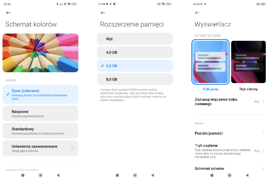 Na przykład wartą uwagi ciekawostką są ustawienia kolorów. Znajdziemy je przez Ustawienia, Wyświetlacz, Schemat kolorów. Domyślnie jest wybrana opcja Żywe, która dostosowuje kolory na podstawie wyświetlanych treści. Obraz, jaki pokazuje telefon, faktycznie przy tych ustawieniach jest bardzo atrakcyjny. Warto jednak wypróbować inne dostępne opcje, jeśli wygląd zdjęć czy projektów graficznych ma dla nas znaczenie. Do wyboru mamy: Nasycone (zawsze poprawia kolory), Standardowy (kontrast zawsze na stałym poziomie), Ustawienia zaawansowane – tu można wybrać gamę kolorów P3 lub sRGB i ręcznie dostosować m.in. odcień, nasycenie czy kontrast.