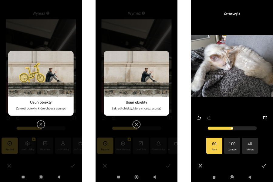 Bardzo sprawnie działa usuwanie obiektów, linii i osób z fotografii. Wystarczy wybrać tę opcję i zaznaczyć niepożądany element na zdjęciu. Działa to naprawdę bardzo skutecznie i elegancko.