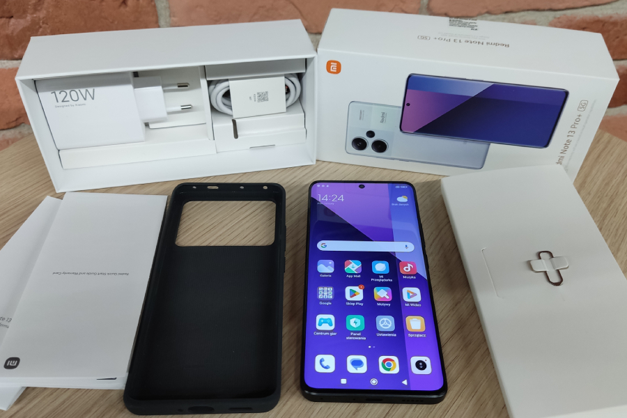 Redmi Note 13 Pro+ 5 G jest dostarczany w standardowym, solidnym opakowaniu. W zestawie z telefonem otrzymujemy: