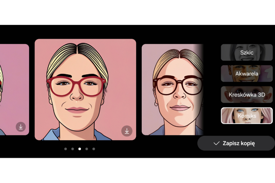 Najbardziej „zwykła” to zaznaczenie obiektu i usunięcie go lub przesunięcie w inne miejsce. Dwie pozostałe są bardziej spektakularne. Studio portretu pozwala nadać zaznaczonej na zdjęciu twarzy styl: Komiks, Kreskówka 3D, Akwarela, Szkic.