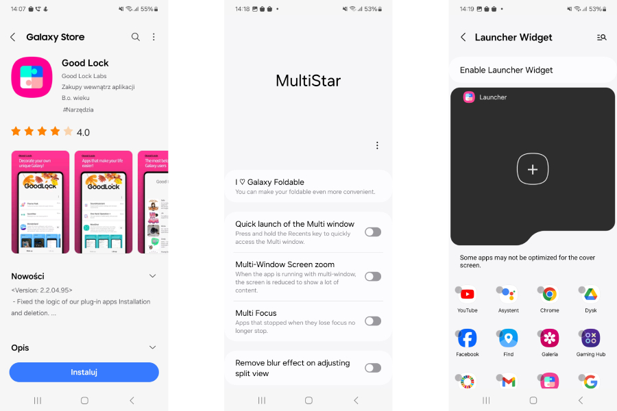 Aby dodać więcej innych aplikacji na ten wyświetlacz, trzeba zainstalować apkę GoodLock z Galaxy Store. Szkoda, że nie ma prostszego sposobu, by rozszerzyć funkcjonalność małego ekranu, chociaż nie jest to żadna wielka filozofia, wystarczy chwila – i zrobione. (W oknie GoodLock u dołu wybieramy Life up, potem MultiStar, I love Galaxy Foldable, Launcher Widget).
