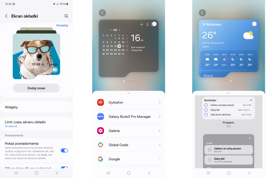 Widżety systemowe, czyli domyślnie wbudowane, jak Kalkulator, Telefon, Zegar czy Galeria albo Health z licznikiem kroków, możemy dodawać z poziomu Ustawień (Ustawienia / Ekran okładki – zmienimy tu też np. tapetę).