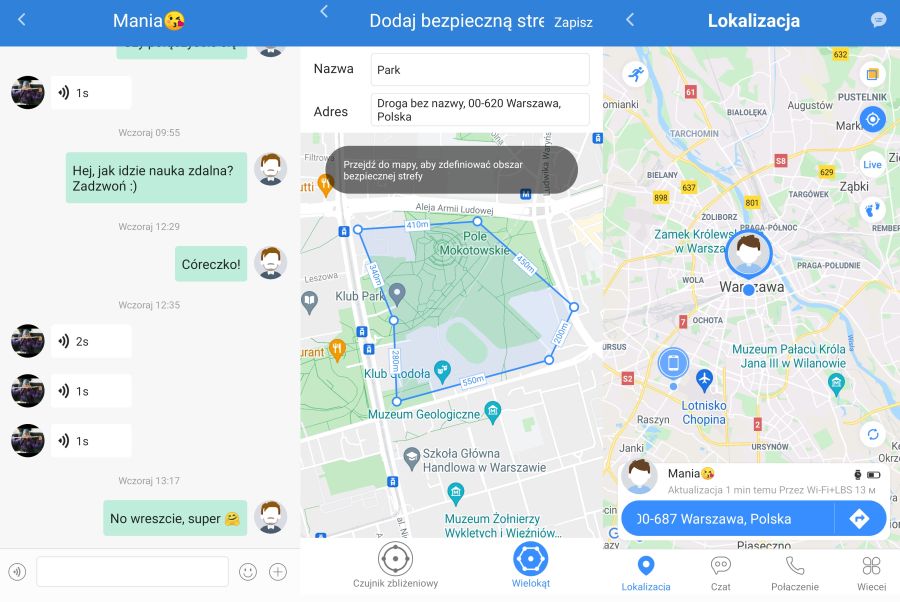 · Ustawia bezpieczne strefy. To fajna funkcja, pozwala precyzyjnie wyrysować palcem na mapie wielokąt, po opuszczeniu którego przyjdzie powiadomienie.