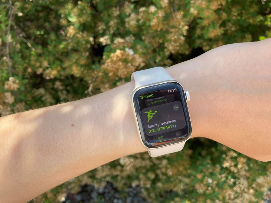 Zdecydowanie częściej niż z funkcji zdrowotnych korzystałam z tych, które umożliwiają monitorowanie aktywności. Nie będę tego ukrywać – zamykanie wszystkich trzech pierścieni z celami daje mi mnóstwo frajdy i świetnie motywuje do działania. Cele dotyczą szacunkowej liczby spalonych kalorii, ćwiczeń, a dokładnie ich czasu liczonego w minutach i godzin na nogach. Bardzo polubiłam się też z preinstalowaną aplikacją Trening, która pozwala na nieco bardziej szczegółowe rejestrowanie działań sportowych. Co dla mnie ważne, lista dostępnych dyscyplin i rodzajów treningów jest naprawdę pokaźna. Poza tradycyjnymi aktywnościami, takimi jak marsz, bieganie czy jazda na rowerze, znalazły się na niej między innymi skating, sporty dyskowe, a nawet gry fitnessowe – do wyboru, do koloru.