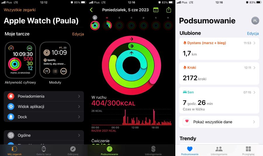 Zanim zegarek mógł na dobre wylądować na moim nadgarstku, musiałam sparować go z telefonem – cały ten proces przebiegł szybko i zupełnie bezproblemowo, włącznie z importem danych z mojego poprzedniego Apple Watcha. Szeroko pojęta personalizacja jest możliwa dzięki preinstalowanej na iPhonie aplikacji. Liczba dostępnych tarcz jest naprawdę duża, a spora część z nich może być dostosowywana do potrzeb użytkownika i umożliwia wyciągnięcie na pierwszy plan najpotrzebniejszych informacji i skrótów do aplikacji. Tym sposobem na tarczy mojego Watcha znalazły się między innymi dane pogodowe i skróty do często wykorzystywanych przeze mnie apek: Przypomnienia i Spotify. Warto też zaznaczyć, że z poziomu smatfonowej aplikacji można również zarządzać wszystkimi ustawieniami smartwatcha.