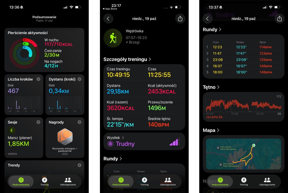 Oczywiście nie zabrakło rozbudowanego monitorowania aktywności fizycznych. Apple Watch 11 standardowo zlicza kroki, spalone kalorie i minuty poświęcone na ćwiczenia, motywując do ruchu za pomocą słynnych trzech pierścieni aktywności. Bogaty wybór trybów treningowych (od biegania i jazdy na rowerze, przez pływanie, po jogę czy taniec) pozwala precyzyjnie rejestrować praktycznie każdą formę ruchu.