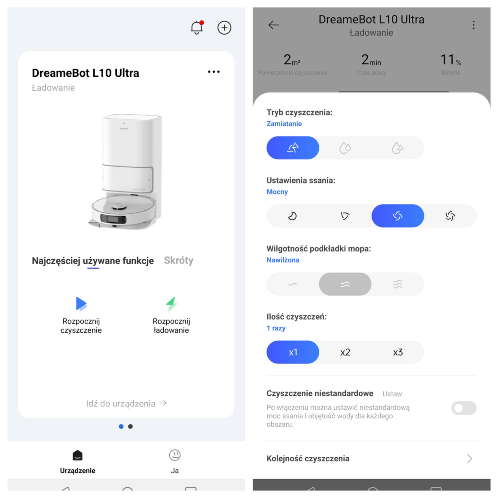 Menu ustawień oferuje wiele opcji, takich jak tworzenie harmonogramów czyszczenia, automatyczne dodawanie detergentu, jak często robot powinien wracać do bazy, aby wyczyścić pady mopa i czy powinien podnosić je nad dywanami lub całkowicie unikać dywanów. Aplikacja umożliwia również zarządzanie ustawieniami ssania, czasem czyszczenia, a także wybranie poziomu wilgotności nakładek mopujących i szczegółów samooczyszczania.