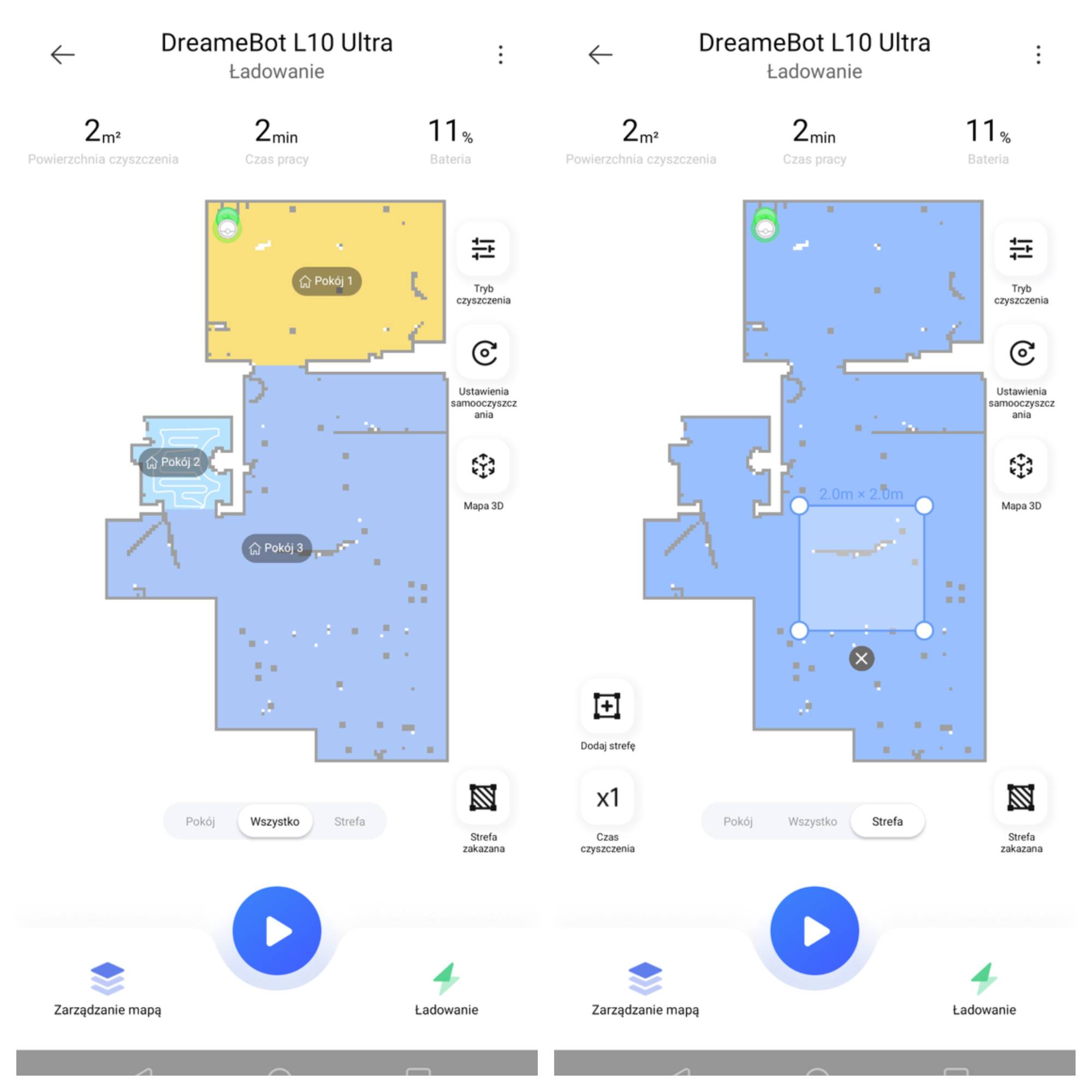 Bardzo mi się podoba, że możesz zaplanować i dostosować czyszczenie do swoich preferencji. Zamiast wysłać robota do wyczyszczenia podłóg w całym domu, możesz ustawić strefy czyszczenia, tak aby Dreame L10 Ultra odkurzał i/lub mył tylko te obszary, które tego wymagają. Możesz ustalić tylko sprzątanie konkretnego pokoju, klikając go na mapie przed rozpoczęciem pracy urządzenia. Możesz też ustalić mniejsze strefy, wybierając na ekranie obszar, który ma być wyczyszczony. Na podobnej zasadzie możesz na mapie ustawić strefy zakazane, czyli obszary, od których robot powinien się trzymać z dala.