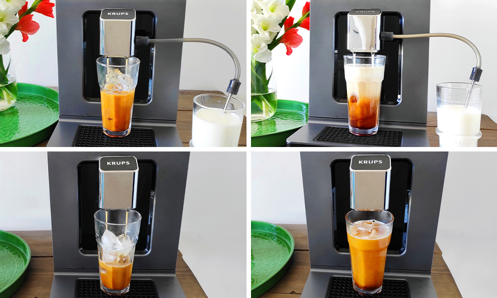 Letnie popołudnie, ponad 30°C za oknem. Któż by nie docenił, że właśnie może testować ekspres z funkcją kawy mrożonej? Dla mnie to przyjemne z pożytecznym i wielka ulga w walce z upałami. Na pierwszy ogień, a właściwie lód, idzie iced cappuccino. Zgodnie z instrukcją na wyświetlaczu umieszczam w szklance 6–8 kostek lodu, podłączam mleko i wybieram odpowiedni napój na panelu. Ekspres najpierw dozuje mleko (wydaje mi się, że ma niższą temperaturę niż przy zwykłym cappuccino), a potem dopełnia je kawą przygotowaną w technologii Cold Brew Aroma, czyli jakiej? Z wykorzystaniem gorącej wody do wstępnego zwilżania zmielonej kawy i chłodniejszej do właściwego parzenia. Efekt? Dla mnie zaskakujący. Po przemieszaniu cappuccino było naprawdę chłodne. Do tego delikatne w smaku, słodkawe, niewodniste.
